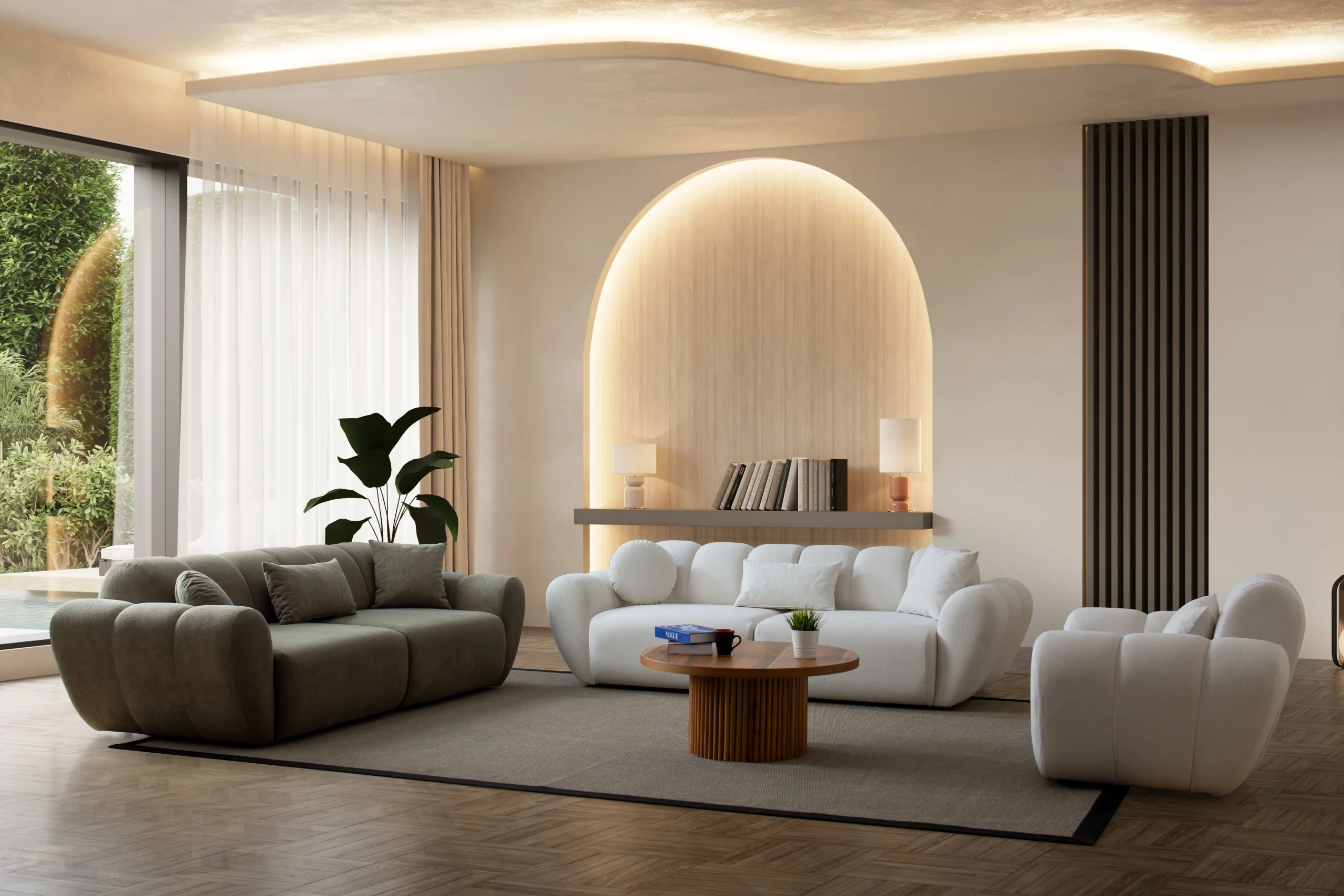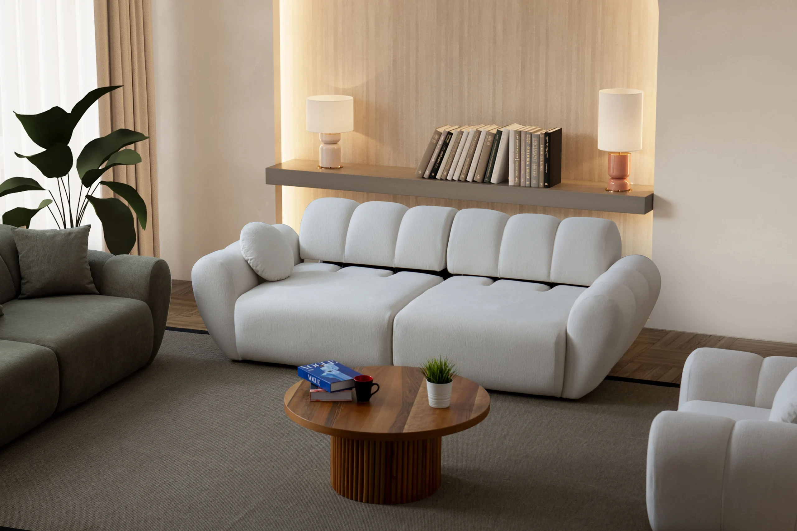 The Alure Sofa defines modern tranquility with its soft, ribbed detailing and voluminous silhouette. This premium ensemble brings a serene yet bold aesthetic to your interior, showcasing world-class Turkish artistry designed for ultimate relaxation. Price includes 1pcs Sofa. For other versions, type “Alure” in the search box.