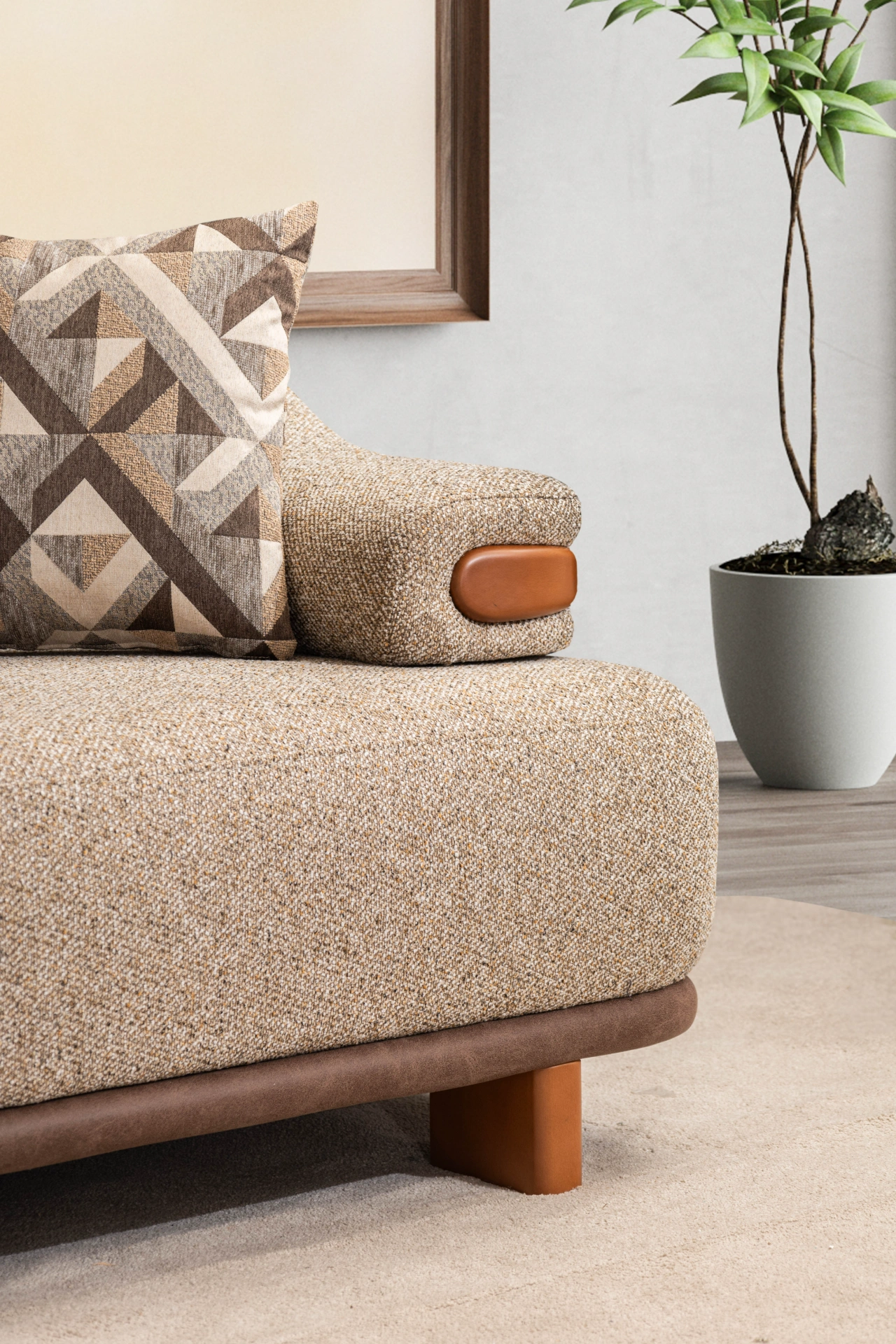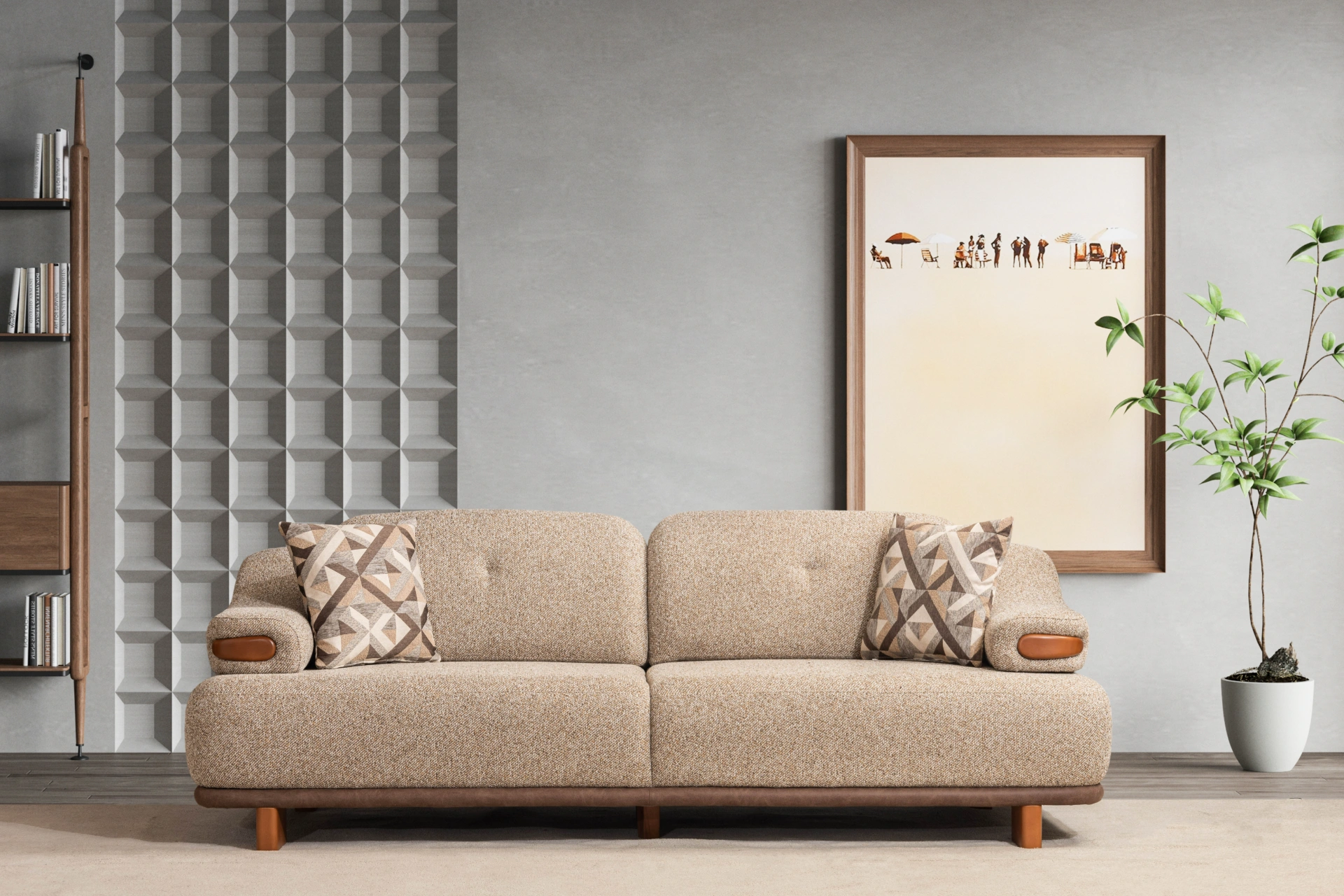 Estelle Sofa is a masterpiece of modern design. Its most striking feature is its high-quality upholstery, offering a unique tactile experience and a visually soft, cloud-like appearance. The organic curves of the seating area contrast beautifully with the structured details found on the armrests and base, creating a balanced and robust aesthetic.
