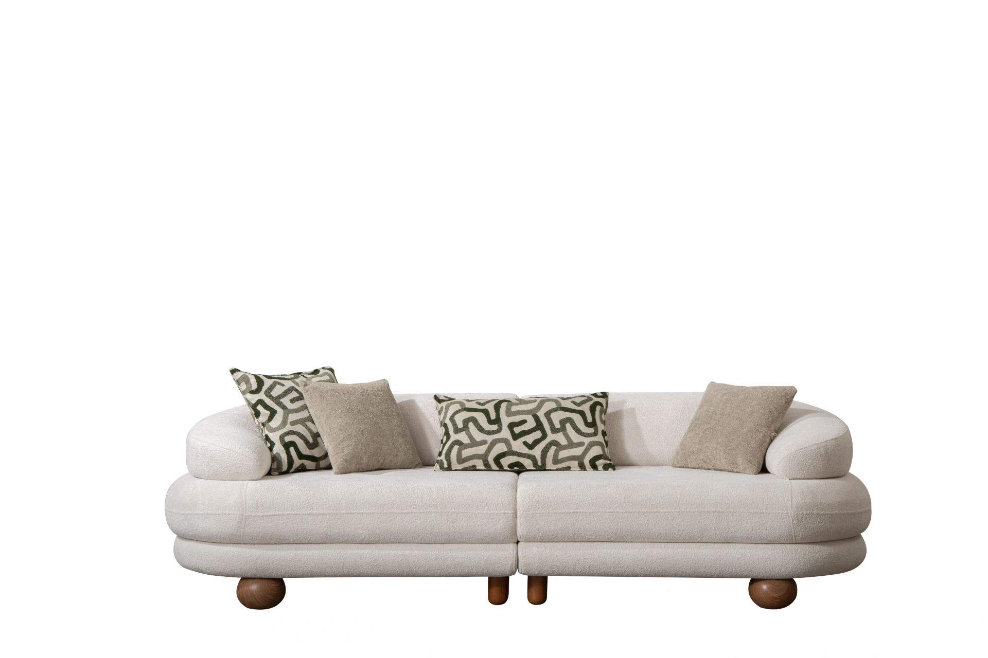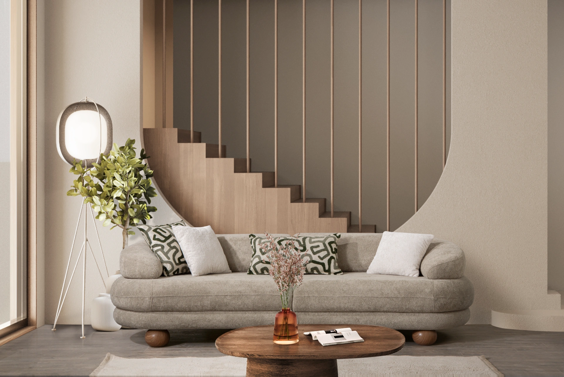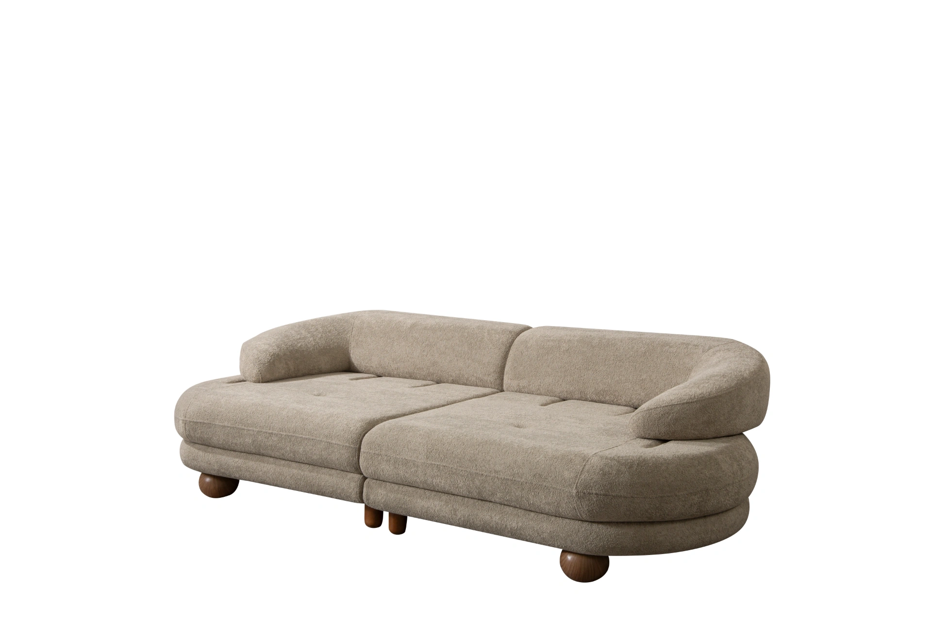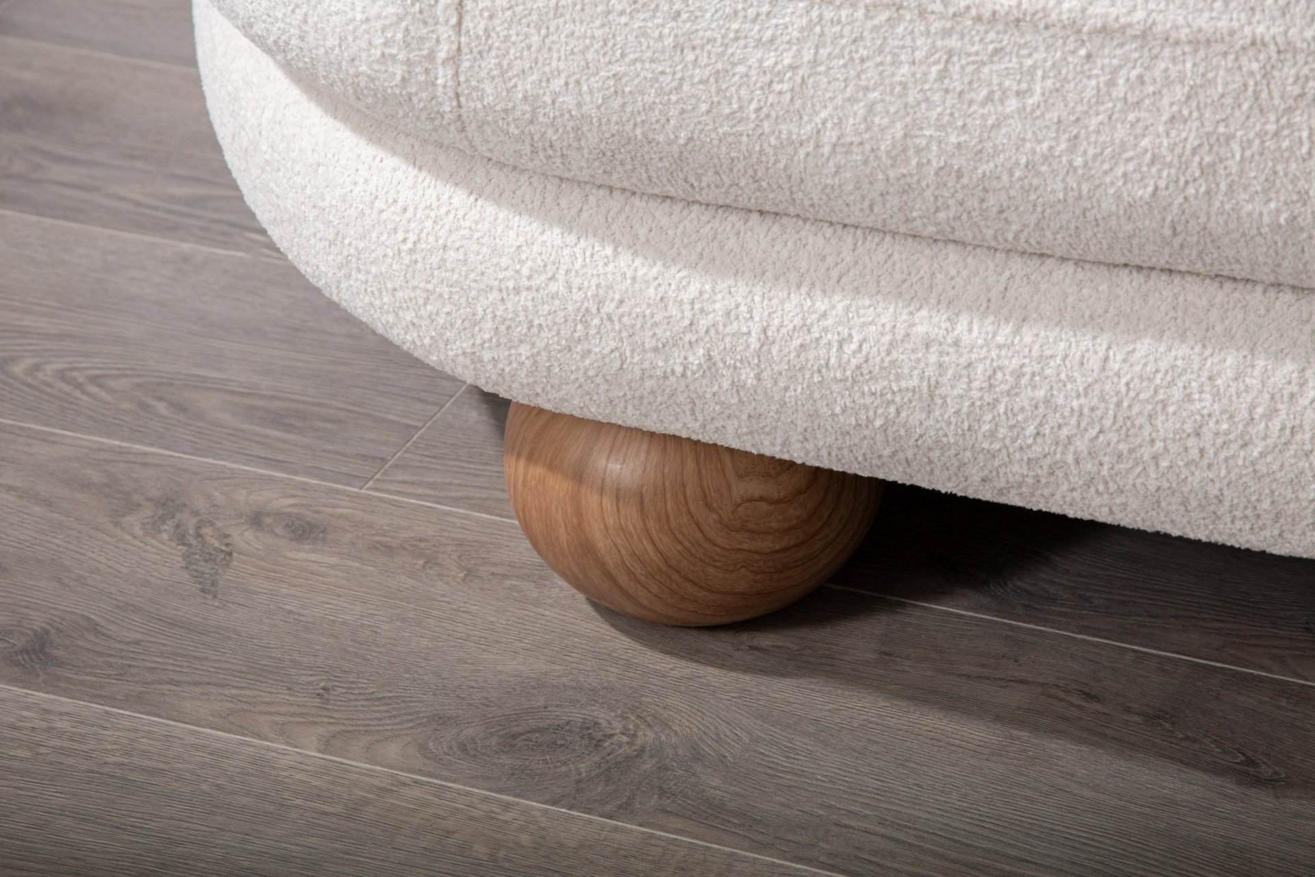 Lara Sofa: Where sculptural art meets everyday comfort. Featuring trendy sand grey and iconic spherical legs.