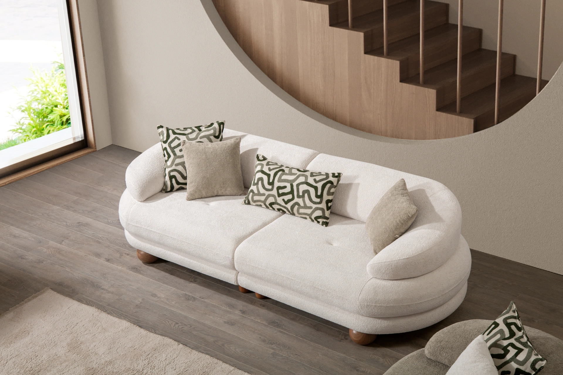 Lara Sofa offers a multi-dimensional texture that is both durable and incredibly soft. Its most striking feature is its large, spherical solid legs, which provide an earthy contrast to the airy fabric. This unique leg design serves as a distinctive architectural element as well as providing superior stability.