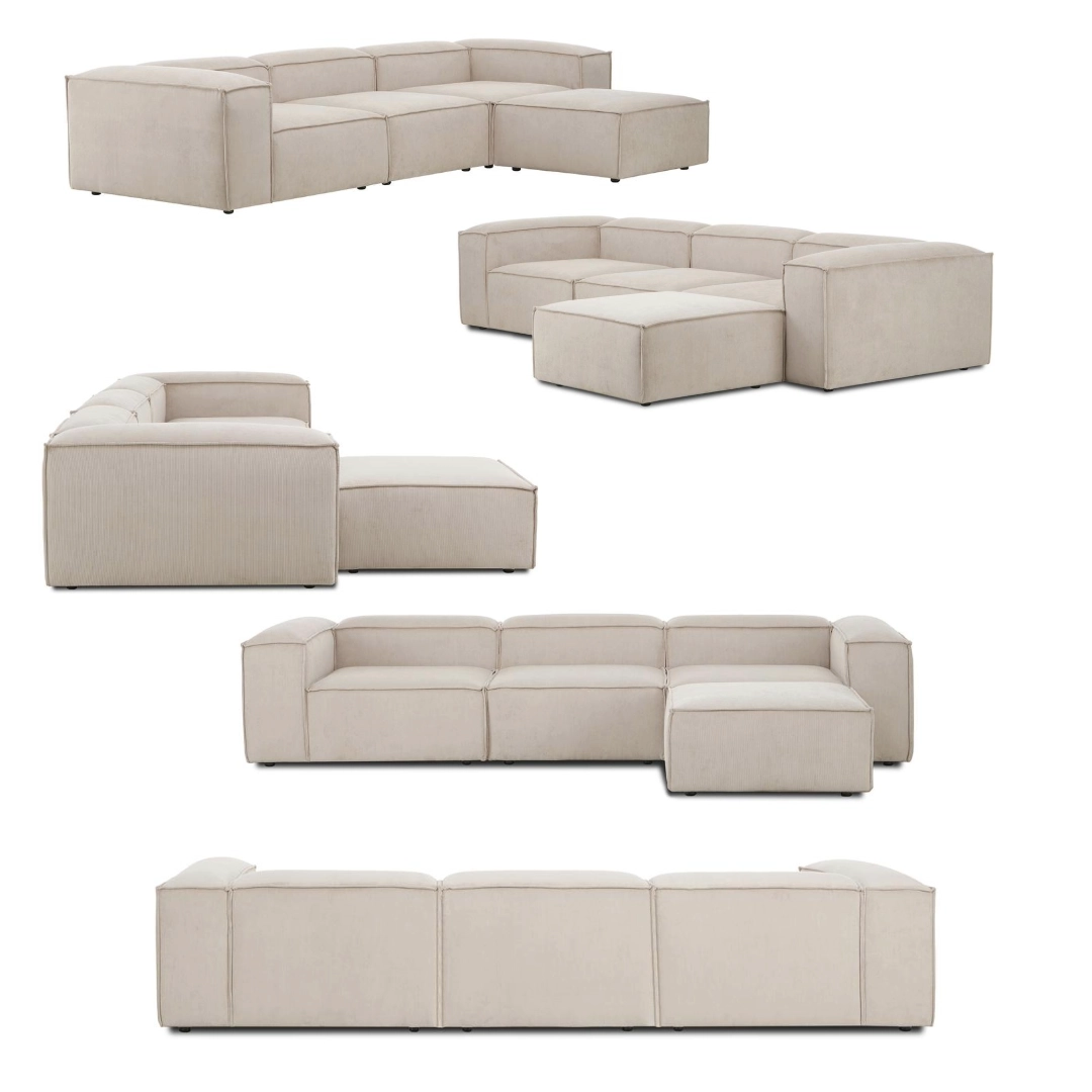 Mekan Modularni Ugaoni Komplet sastoji se od 4 Modula (2 ugaona, 1 srednji, 1 Otoman). Moduli se jednostavno međusobno povezuju pomoću mehanizma za zaključavanje koji se nalazi ispod ugaone garniture. Možete ih kombinovati i raspoređivati prema sopstvenim željama, u zavisnosti od prostora. Po želji, garnituru možete koristiti kao 3 + 1 set, kao ugaonu garnituru, ili kao dva odvojena dvoseda.Imate mogućnost da sami prilagodite raspored sedenja prema prostoru u vašem domu.